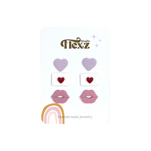 Met deze set zit je nooit een dag zonder bijpassende oorbellen. De ene dag kun je kiezen voor zachte hartjes, de volgende dag voor liefdevolle lippen die denkbeeldig de hele dag door kusjes geven.