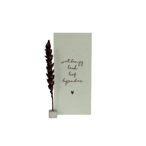 Wil je iemand verrassen met iets kleins, maar bijzonders? Deze pastel groene wenskaart met droogbloem in een mini klei-standaard is een cadeau dat blijft staan, letterlijk en figuurlijk. De liefdevolle tekst 'Wat ben jij leuk, lief, bijzonder' is bijvoorbeeld ideaal als hartverwarmend gebaar, bedankje óf omdat je vindt dat de ander het verdient.